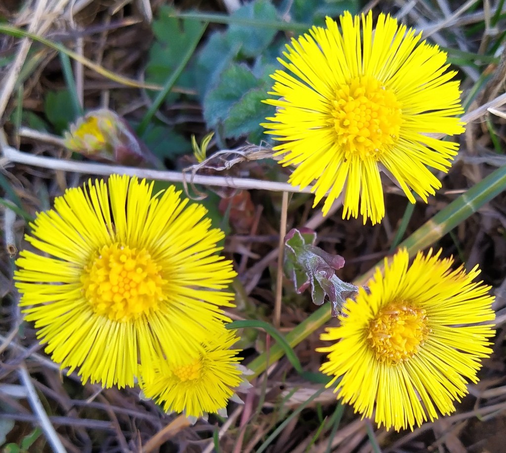 In the fields, verges and on the edge of the copse, there are clumps of blooming primroses and the vivid yellow cheerfulness of the lesser celandine and coltsfoot are a contrast with the surrounding hues of green and brown.