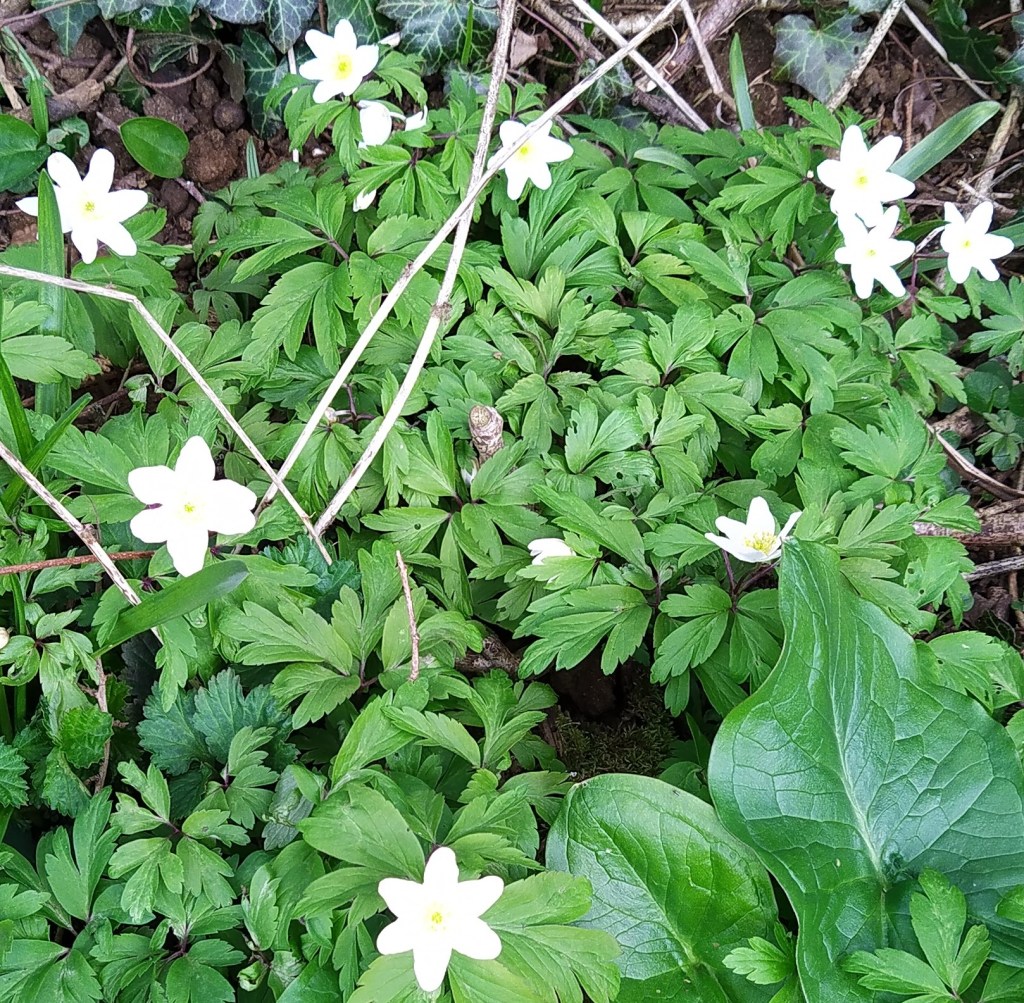 In the shady areas of the copse, the first of the pretty star-like white wood anemones beginning to flower, low to the ground in between the glossy bluebell foliage which is already carpeting much of the woodland floor. The presence of wood anemones is a sign of an ancient woodland as the species spreads at such a slow rate. I find this a grounding thought and wonder about those who have walked through these woods in the years and even centuries before.